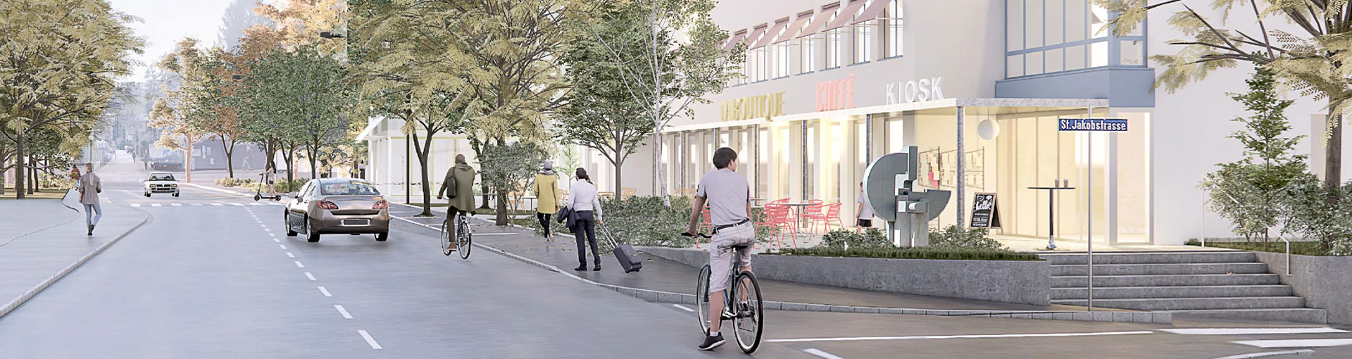 Die Bahnhofstrasse ist Teil des Stadtzentrums «Pratteln Mitte» und verbindet den Bahnhof mit dem historischen Ortskern. Sie ist nicht nur eine bedeutende Verkehrsachse, sondern auch ein belebter öffentlicher Raum mit Geschäften, öffentlichen Einrichtungen und dem Jörinpark. Das Areal Bahnhofstrasse / St. Jakobstrasse umfasst drei Parzellen im Eigentum der evangelisch-reformierten Kirchgemeinde, der Post sowie des Kantons mit dem kantonalen Amt für Industrie, Gewerbe und Arbeit (KIGA). Im Rahmen eines Studienauftrags haben die Grundeigentümerschaften die abgestimmte Entwicklung des Areals entworfen.
