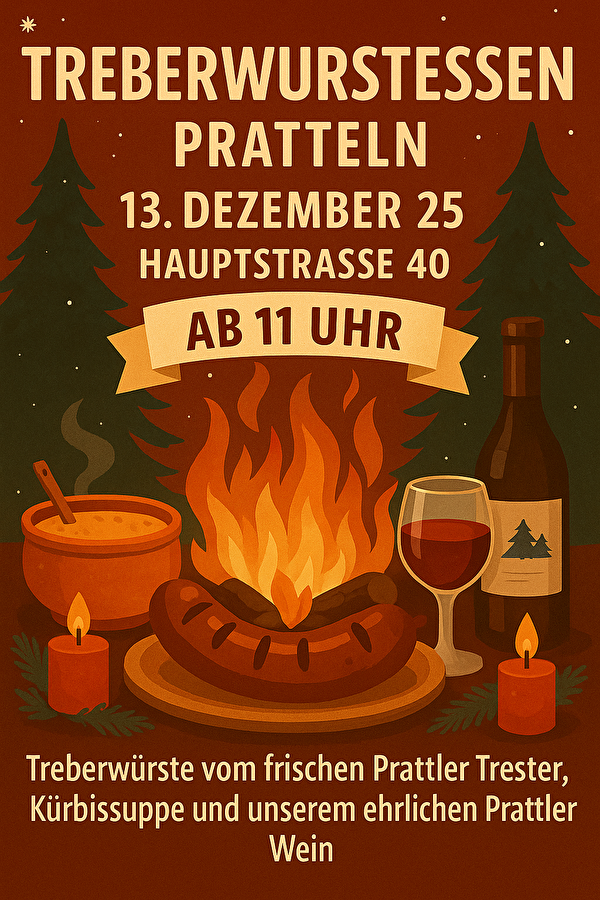 Die drei Prattler Winzer laden zum gemütlichen Treberwurstessen ein! Es gibt feine Treberwurst mit Kartoffel-Lauchgratin, wärmende Suppe und vieles mehr – natürlich mit unseren eigenen Prattler Weinen im Glas. Kommt vorbei, geniesst gutes Essen, lokale Weine und eine gemütliche Stimmung unter Freunden.